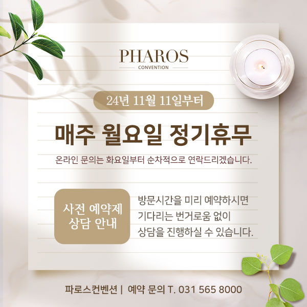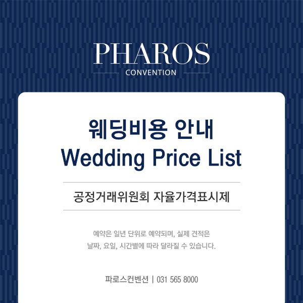 웨딩비용 안내 (공정거래위원회 자율가격표시제) 예식장 자율가격표시제에 따라 아래와 같이 파로스컨벤션의 소비자가를 알려 드립니다.… 2026.03.09 MORE 24년 11월 11일 부터 매주 월요일 정기 휴무 파로스컨벤션은 2024년 11월 11일(월) 부터 매주 월요일 정기 휴점합니다. 방문일자를 확인하셔서 귀한 발걸음 헛되지 않기를 바랍니다. 파로스컨벤션은 사전 예약제로 운영되며 방문전 예약을 하시면 보다 편리하고 정확한 상담을 받으실 수 있습니다.… 2024.11.04 MORE 1