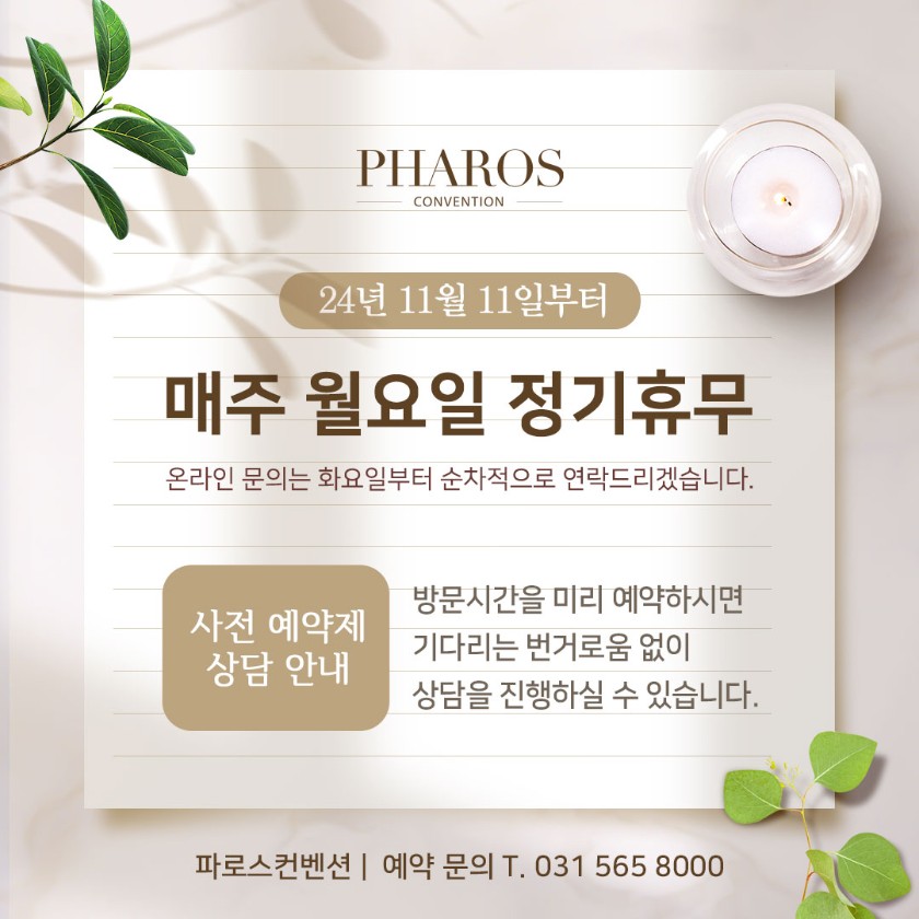 24년 11월 11일 부터 매주 월요일 정기 휴무 파로스컨벤션 2024.11.04 1995 파로스컨벤션은2024년 11월 11일(월) 부터 매주 월요일 정기 휴점합니다.방문일자를 확인하셔서귀한 발걸음 헛되지 않기를 바랍니다.파로스컨벤션은사전 예약제로 운영되며방문전 예약을 하시면 보다 편리하고 정확한 상담을 받으실 수 있습니다.예약 문의031-565-8000 목록 이전글 웨딩비용 안내 (공정거래위원회 자율가격표시제) 다음글 다음글이 없습니다.